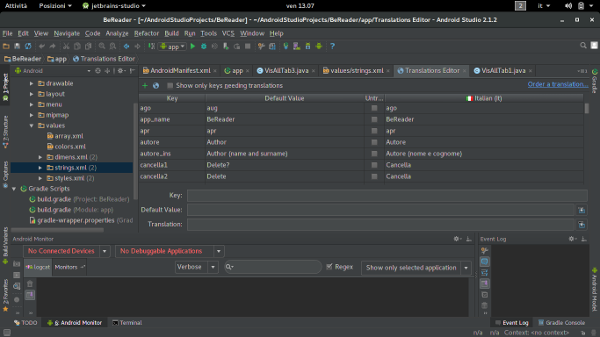 Le stringhe mi hanno portato via un pò più di tempo essendo partito con l’italiano come lingua di default (beata ignoranza), Android Studio mette a disposizione un valente editor delle traduzioni che facilita molto il lavoro di traduzione. Vediamo come richiamarlo e come utilizzarlo (è molto intuitivo, quindi utilizzeremo degli screeenshot).